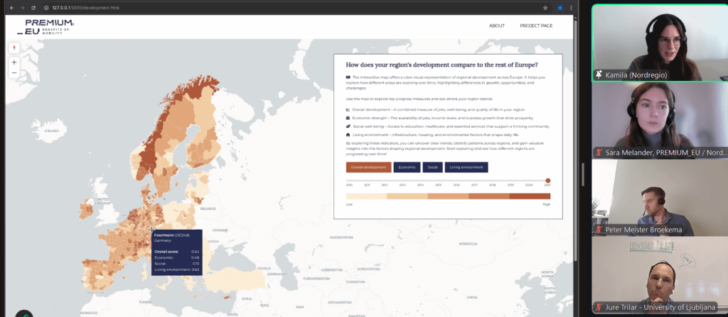 Kamila Dzhavatova (Nordregio) demonstrated the PREMIUM_EU Dashboard, guiding participants through its regional profiles, comparative indicators, and migration projections. Using Mentimeter polls and open discussion, participants shared impressions and ideas for how policymakers could use the dashboard locally.