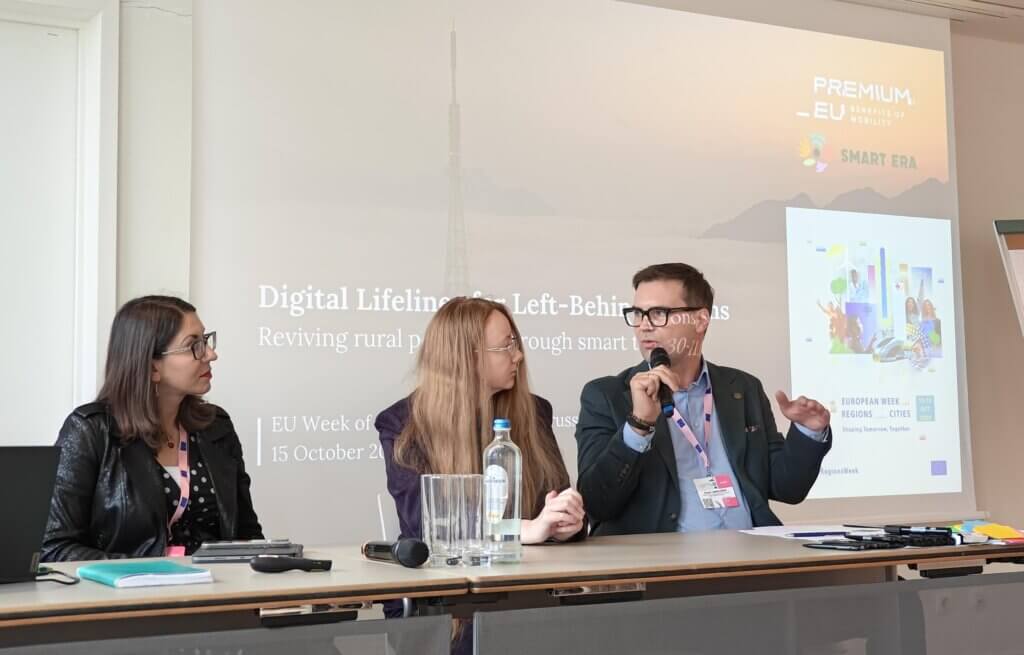 At this year’s EU Week of Regions and Cities, a small delegation from the PREMIUM_EU project took part in three events highlighting how data and digital tools can empower policymakers to respond to demographic decline and skills shortages. Regional development researcher and Dashboard developer Becky Arnold, Project manager Leo Van Wissen and Communications manager and Dashboard coordinator Anne Katrine Ebbesen had 2½ intense days both attending and participating in the programme in Brussels, along with our Resilient Regions Expert Group member and panelist, Pawel Chmielinski from European Rural Development Network.